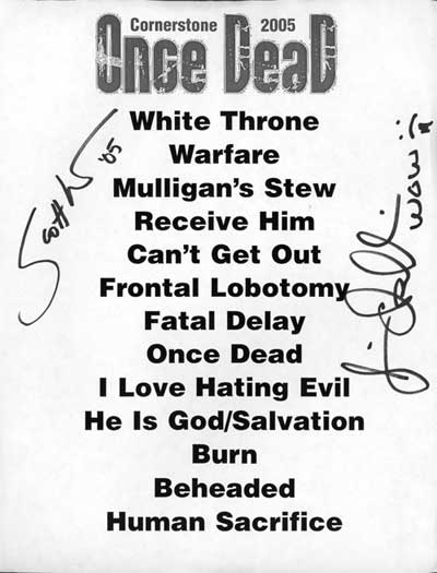 Roxx Productions is a booking company from California that has been effective in reuniting some classic Christian metal bands for concerts such as Stryper, Barren Cross, Recon and on August 29th, 2004, four of the original members of legendary thrashers Vengeance Rising. Of course most people familiar with the band have read how former vocalist Roger Martinez has chosen not to follow his former Christian beliefs any longer. There is a long story why the original band members left following the 1990 Once Dead tour. However, suffice it to know that the band members were ready to call it quits so they agreed to give Roger Martinez the rights to the name Vengeance Rising, as well as all the publishing rights to the original songs. This is how it was left when the original Vengeance Rising parted ways. Because of this, and out of respect to their contract with Roger, the original four members decided to bring on a new vocalist and rename the band Once Dead. Enter yours truly. Since I am the vocalist for this live show, it is a bit hard for me not to be biased. So instead of a review, I will just share some of my thoughts on the DVD, the show and the entire experience. First of all it was an honor for me to share the stage with these guys. Had this been the only show I ever got to do with them, I would have been grateful. What more can a fan ask for than to actually get the opportunity to sing for one of his favorite bands? Fortunately this show is not the end of Once Dead, but more on that later. I spent two solid months learning the songs for this show. I probably looked like a complete nutcase driving down the road singing all the old Vengeance songs in my car. I am sure I looked like even more of a nut as I was mouthing the words to the songs at the gym during my cardio time with the headphones blasting in my ears. No doubt, I cannot sing these songs without banging my head, making various hand motions, etc. I am sure it was quite the sight. Every moment I had to get a CD on and be by myself I was playing Vengeance. As big of a fan as I already was, I was actually surprised by how little of the lyrics I actually knew. Martinez was always a very charismatic preacher and his lyrics reflected this. However, one thing I didn't notice in the past was the bits of humor thrown into the songs. "Can't Get Out" for instance has the line "I smoked away my frustrations, I took it out on my wife, I even tried to smoke her too, she wouldn't fit in the pipe." I laughed out loud when I read these lines. Why I hadn't noticed them before is a mystery. I was quite anxious to meet the band for the first time. Vengeance roadie Ken picked me up from my hotel room to take me to the studio we were to practice in. Here I was a 36 year old man and feeling like a kid getting to meet his favorite band. I figured I may never see these guys again after this show, so I took along some stuff to have them sign. Yes, I acted like a silly fan. Wouldn't you? To my delight, Doug, Larry and Glenn actually got a kick out of seeing the old 8x10 Vengeance Rising glossy I brought along to have them sign. I can honestly say that the Once Dead guys are all some of the nicest people I have met. With the fan stuff out of the way, it was now time to get down to business. However, what I failed to remember is that these guys hadn't actually played together in almost a decade. They were reminiscing, sharing stories about the road, the studio, the other band members, funny mishaps, etc. They told me glowing stories about Roger Martinez and how much they missed him. Vengeance Rising were a family in those early days, so much so that even all their roadies from that 1990 tour came back for this reunion show. All of them were there sharing stories from the road. It was quite the reunion party at that first practice and then again when we sat down to a meal together a few days later. The big show was less than a week away when I arrived in California, so we only had time for about three practices before the big show, and only one of those would be with the entire band. We practiced for several hours at each practice session. The first two practices went great. I felt good, I was belting out the lyrics and the band sounded awesome. Larry recorded some of the practices and it was amazing how good the band sounded, despite not having played together in a decade. The last practice was to be on the morning before the show. Bassist Roger Dale Martin was flying in that morning as well and we would have one final practice with the entire band. Wouldn't you know I wake up that morning feeling like crap! Yup, I was getting sick. I really wanted to freak out, but instead I kept my cool and drank a TON of water. I mean, I drank gallons of lemon water that day making sure I would have enough voice to not only get through practice, but also an interview for the DVD, a set with my band Ultimatum and the final set with Once Dead. Once on stage I was bursting with energy, despite a slightly sore throat and having recently finished my set with Ultimatum. I can honestly say that God granted me the voice to get through that set because shortly after Once Dead left the stage after the final encore, my voice was gone. As many shows as I have done over the years, I have never had that happen to me even when doing more than one show on a day. Listening back to the DVD now I can hear a bit of strain in my vocals, but despite that, I like the otherwise raw, live delivery I gave for that show. I can tell you that the band was struggling a bit on stage due to poor monitoring and mixing from the club. Unfortunately Larry Farkas wasn't heard at all on stage, making things a bit rough for all of us. However, we troopered through it and the fruits are now available for all to see on this DVD release. Personally, I think the songs sound great. There are no studio fixes on this DVD. There are no overdubs to fix the rubs. This is raw, heavy and live, just like you would have h