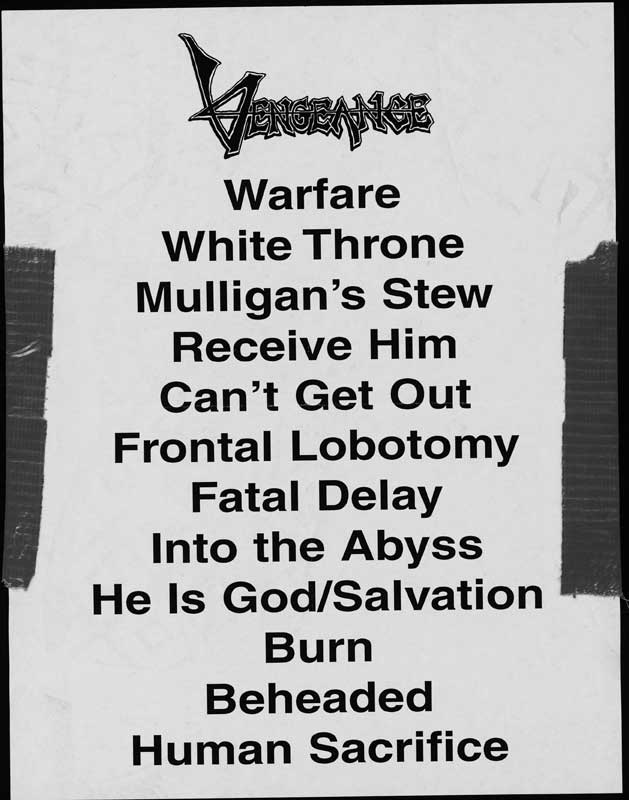One noticeable problem that arose that night is seen on the DVD if you watch carefully enough. During "Into the Abyss" my wireless mic went out completely. Our stage crew didn't seem to notice right away and for some strange reason the guy running the sound wasn't behind the board. I grabbed one of the backup mics for the remainder of the show and shared my vocal mic several times with Roger Dale Martin for some of the gang vocals. On top of the standard set, the band decided to throw a new song on me a day before the show. Neither I nor Roger Dale Martin had heard this new song yet, but both of us jumped in and put forth our best effort. So what exactly am I saying in this song? To be honest, I don't know, the words were made up on the spot that evening at the show as no lyrics had been written yet. Right on! That was fun. This song is included as part of the bonus material on this disc. This song may see the light of day on a future recording from the band. So, no, the entire show is not included in the concert footage of the DVD. As a matter of fact, some of the in between song banter between myself and the crowd was also cut out, due to time restraints on the DVD and the amount of bonus material the band wanted to include. However, some of that banter can be heard in other parts of the DVD. Speaking of the crowd, they were great. It's so much easier to put on a good performance when the crowd is into the show. This crowd was. You could feel the energy in the place. Heads were banging almost the entire time. I enjoyed interacting with those who were crammed up against the stage and even gave some of them opportunities to bark out the chorus on "Burn". I was truly blessed to see one of my vocal heroes in the front row. Ron Rinehart of Dark Angel fame was there and really encouraged me. To all those people in the crowd, you guys rule! The DVD offers a fairly lengthy interview with the band and covers questions about the breakup of Vengeance Rising, what happened with Roger Martinez, what the band members have been up to since the breakup, and some other subjects of interest to Vengeance die-hards. You will see that the band has no hard feelings towards Roger at all and have nothing but great things to say about him. As well, the DVD includes a photo gallery that features pictures of the practices before the show, the interview and the actual show that evening. As an added bonus a live video of Ultimatum was also added. Finally there are individual discographies for each band member. One interesting note about the track listing on the DVD. If you go into the individual song listings you will see the original song list that the band used on the stage that is autographed by the entire band. Seven copies of that song list were printed. I grabbed five from the stage and the other two disappeared. I have the original autographed copy as seen on the DVD. Several of the other copies were sent to some of my other Vengeance die-hard fans. Those are quite the collector's item for a Vengeance fan. It should be noted that I am writing these thoughts based on the advance, test copy I received in the mail prior to the actual release. Several changes were made between that time and the final release. This show was released as a limited edition bonus disc with the 2010 remastered version of Vengeance Rising - Once Dead. It has also been bootlegged and pressed to CD by InRock Records. 'Return with a Vengeance' set list